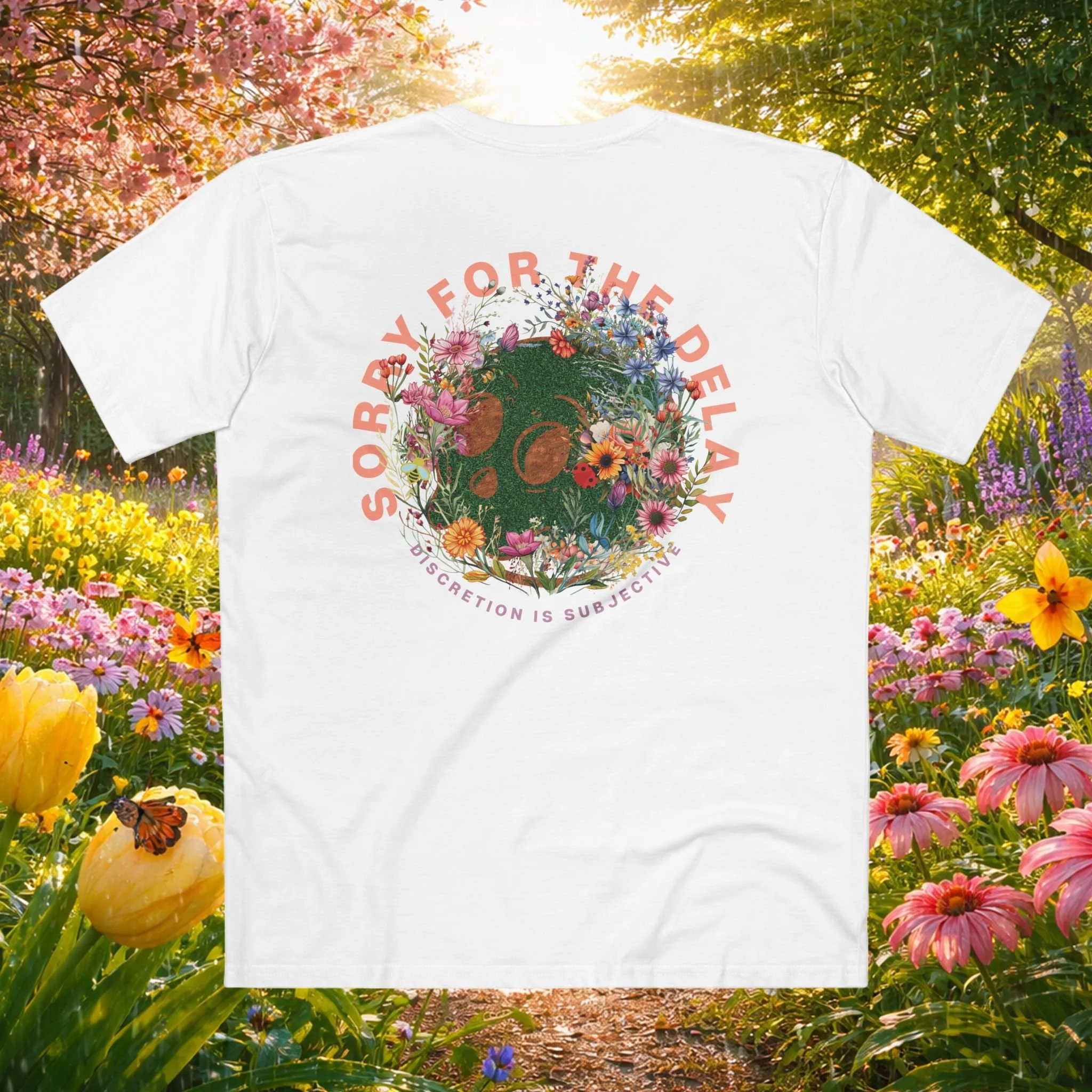 This grassy little skull decided to bloom fashionably late, showing up surrounded by wildflowers like nature itself RSVP’d “SORRY FOR THE DELAY.” Bees buzz, ladybugs chill, and the whole garden vibe says life, death, and pollen season can absolutely coexist. And with “DISCRETION IS SUBJECTIVE,” this floral troublemaker proves even a skull can stop and smell the roses.